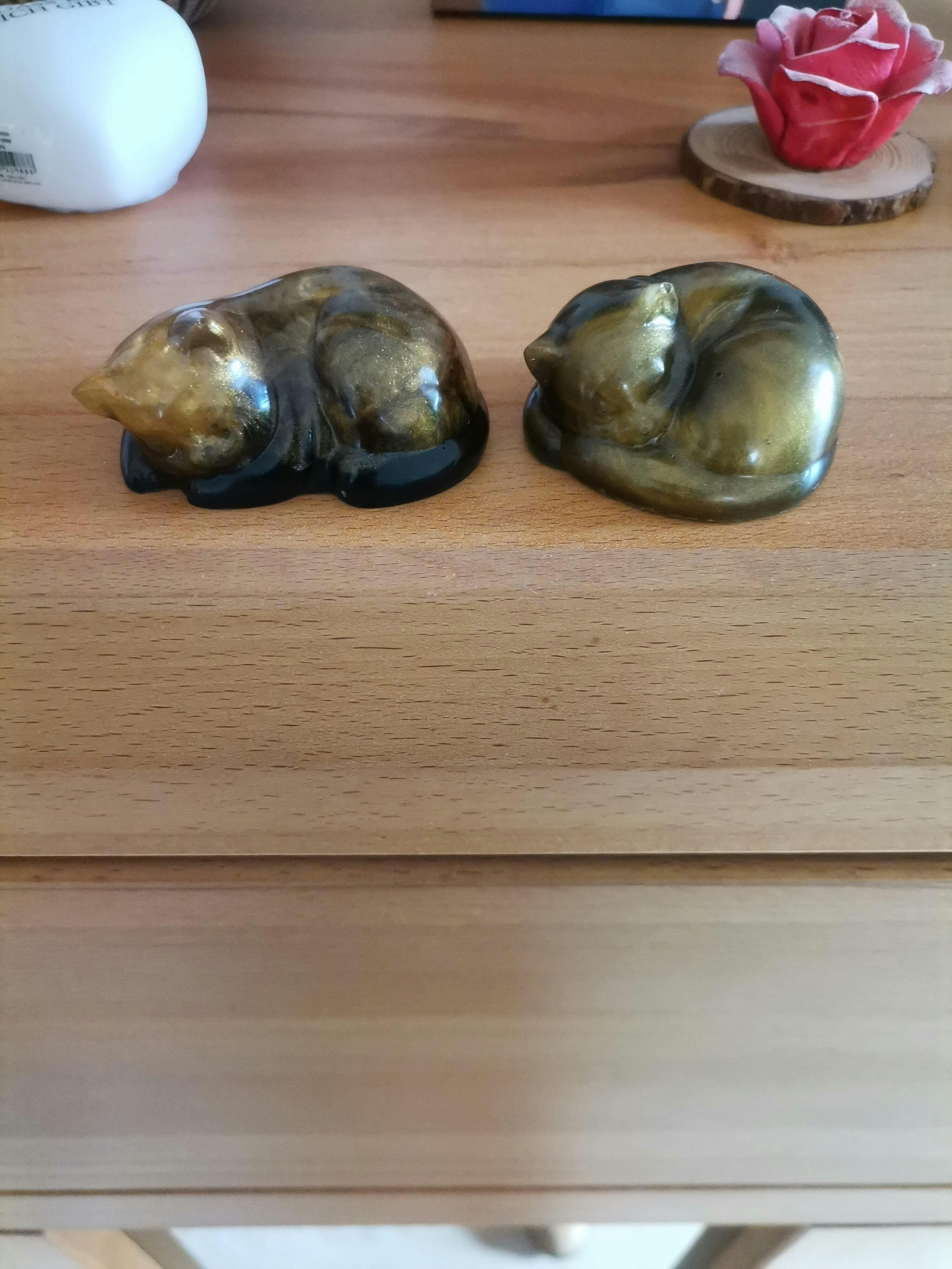 Die beiden Katzen sind auch sehr schön. Die habe ich nicht extra anfertigen lassen, sondern bei Sofortkäufe gekauft, weil sie mir dem Gold schwarz zufällig wunderbar in mein Farbchema gepasst haben. Auch vielen Dank hierfür. Mir haben alle 4 Produkte sehr gut gefallen. Danke für die wundervolle Arbeit